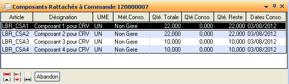 Composants rattachés Nomenclature SST: Permet de visualiser la liste des composants de sous-traitance rattachés à la commande courante, toutes lignes confondues.
