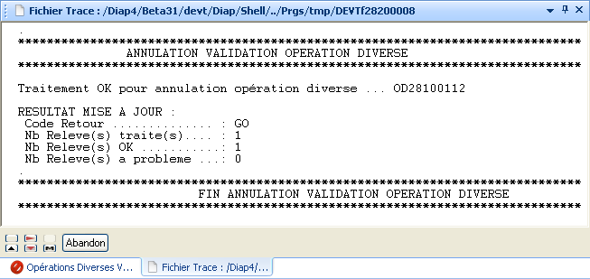 Cette action à pour effet d’effectuer la mécanique inverse de la précédente, c’est à dire que l’entête d’OD va voir son statut passer de « Validée » à « à Valider », et les écritures comptables correspondantes sont supprimées. En retour de l’action, une trace d’exécution est affichée, si il y eu une erreur lors de l’annulation de validation, le libellé de cette erreur est affiché, et l’OD reste validée.