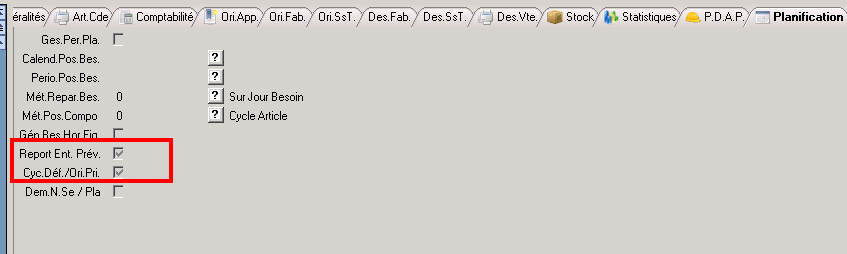 ➡️ On coche les champs Report Ent. Prév [PlaGenDEP], et Cycle Déf./Ori.Pri. [PlaBeBInf].