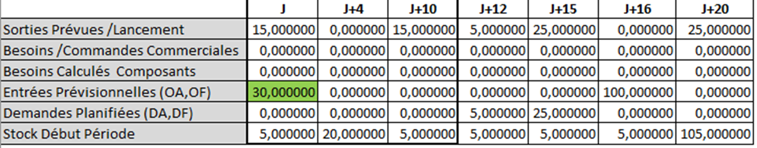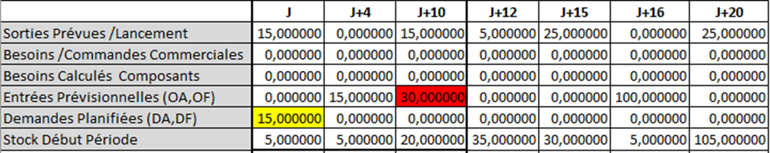 Le calcul de besoins nets positionne une demande d’approvisionnement au jour J pour éviter la rupture.