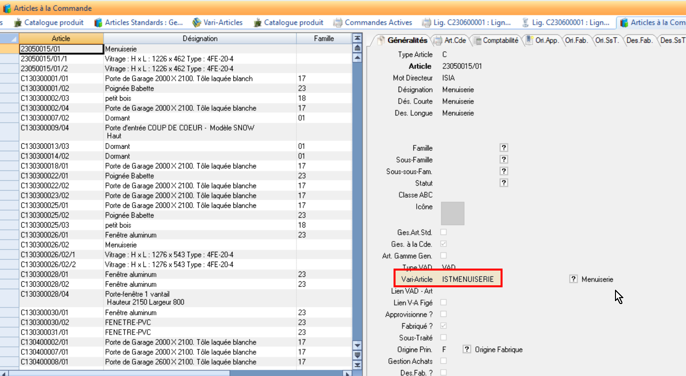Sélectionner la présentation de gestion: on voit le champs vari-article dans l’Onglet Généralités !