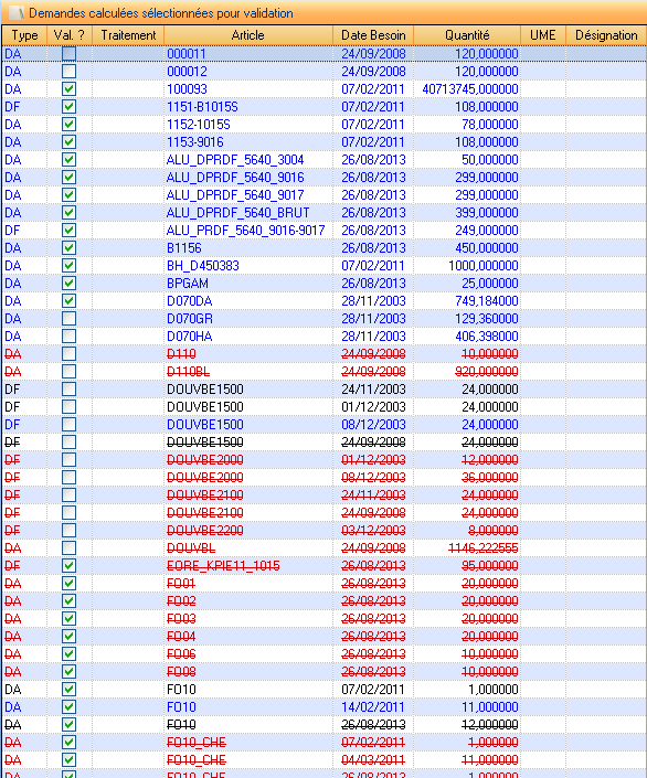 Les lignes noires barrées correspondent aux demandes d’un article sélectionné et pour lesquelles la date est supérieure à celle de l’élément sélectionné.