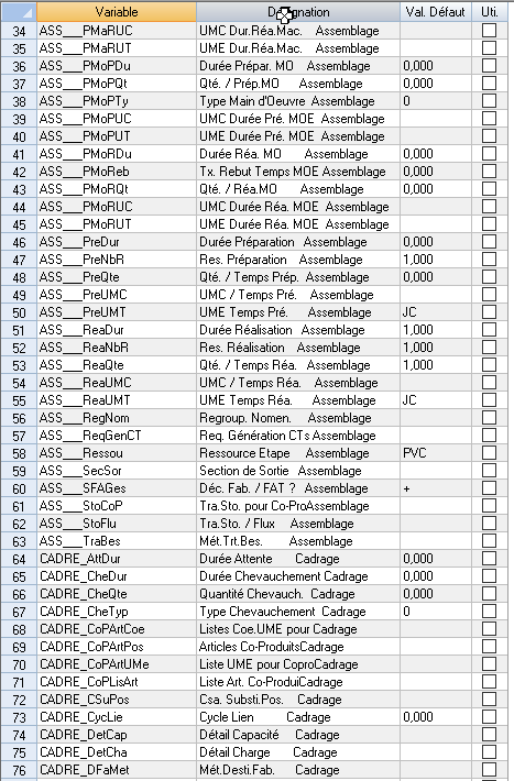 Variables et requête: Présentation de la liste des variables de la gamme générée.
