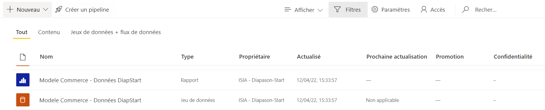 Depuis l’espace de travail, les rapports et les jeux de données sont consultables. Le jeu de données correspond au modèle de données créés sur le Power BI Desktop et peut être réutilisable pour créer de nouveaux rapports. Le jeu de données peut être actualisé afin de mettre à jour les données et ainsi les rapports.