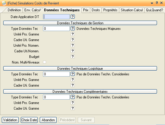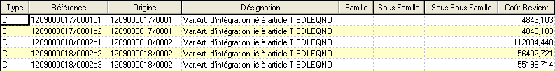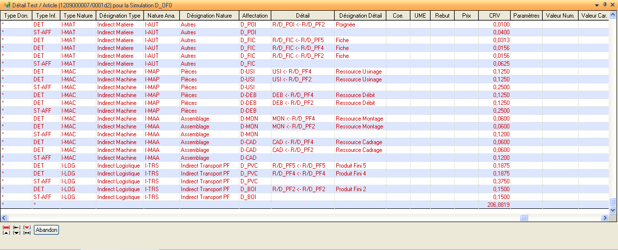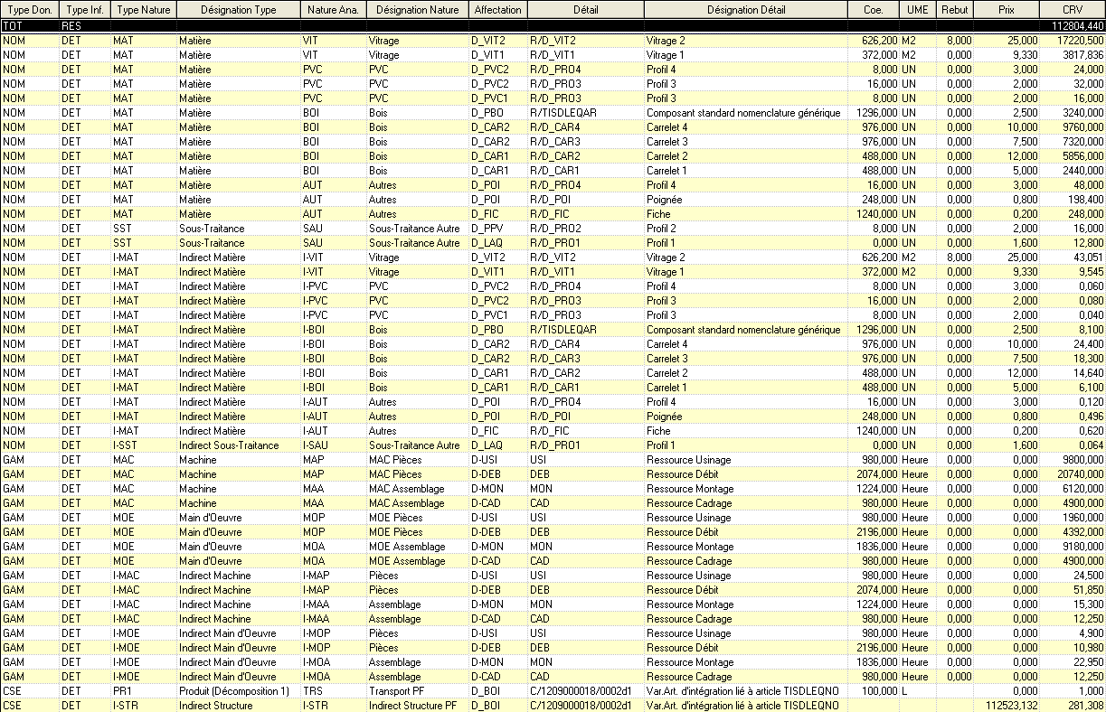 Type Don.: Permet d’indiquer à quoi est lié la ligne du détail. Est-une ligne détail liée à la nomenclature de l’article (NOM) ou bien liée à la gamme de l’article (GAM) ou bien liée au composé lui même (CSE). Le Type correspond à ‘TOT’ correspond à ligne présentant le coût de revient total.