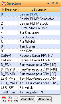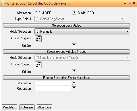 Critère: Saisie si le mode de sélection est différent de manuel. Contient suivant le cas soit une référence de liste d’articles, soit un critère d’extraction d’articles, soit une requête REB, soit une référence environnement quantités de type coût de revient. Idem pour le volet de sélection des articles tracés. Ce volet n’est actif que si la simulation autorise une traçabilité partielle, sinon la zone ‘Mode sélection’ contient la valeur ‘Tous les Articles sont Tracés’