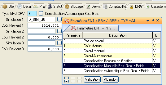 Type Calcul: Type de calcul à utiliser dans le cas d’un paramétrage de valorisation par OF. Ce type de calcul n’est proposé que si le paramètre général PRV-PAROF n’est pas coché. (Voir Paramétrage Valorisation / OFs).