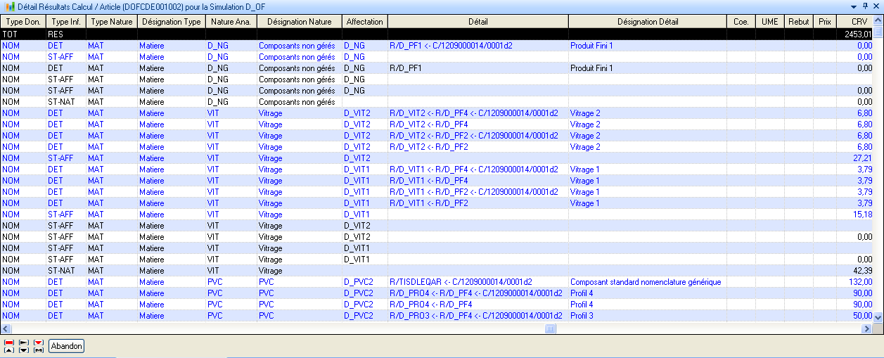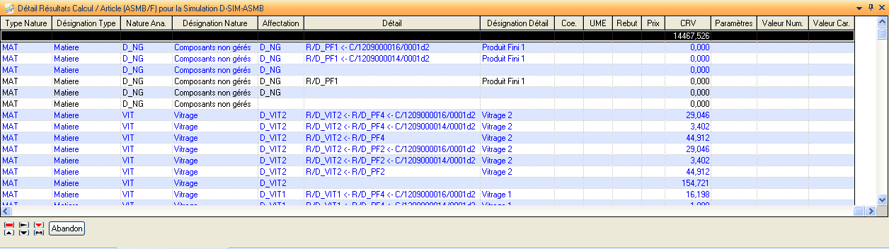 Les lignes bleues sont disponibles uniquement lors d’un calcul détaillé (mode indiqué lors du calcul via saisie de critères), elles détaillent le résultat CRV consolidé sur chaque nature analytique. Dans l’exemple donné le calcul est effectué sur l’article D_PF5 pour lequel il n’y a pas de vitrage, par contre il est lui-même composé de deux composants D_PF2 et D_PF4 qui en sont composés.La simulation gérant le coût du vitrage, le détail apparait en bleu avec la traçabilité « type composant / référence composant <- type composé / référence composé »
