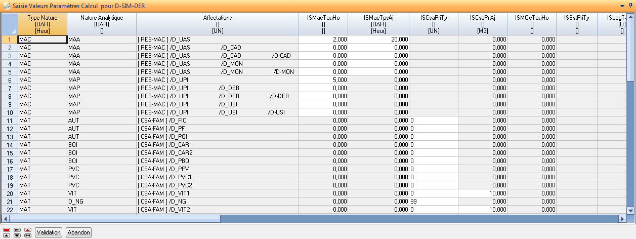 Cette action a pour but de lancer l’application de saisie des valeurs de paramètres de façon globale (correspond à lancer cette action depuis le niveau 1 dans la définition de la structure de la simulation). Le tableur présente en colonne tous les paramètres impliqués dans la simulation courante et en ligne toutes les affectations. Les cellules grisées ne sont pas saisissables.