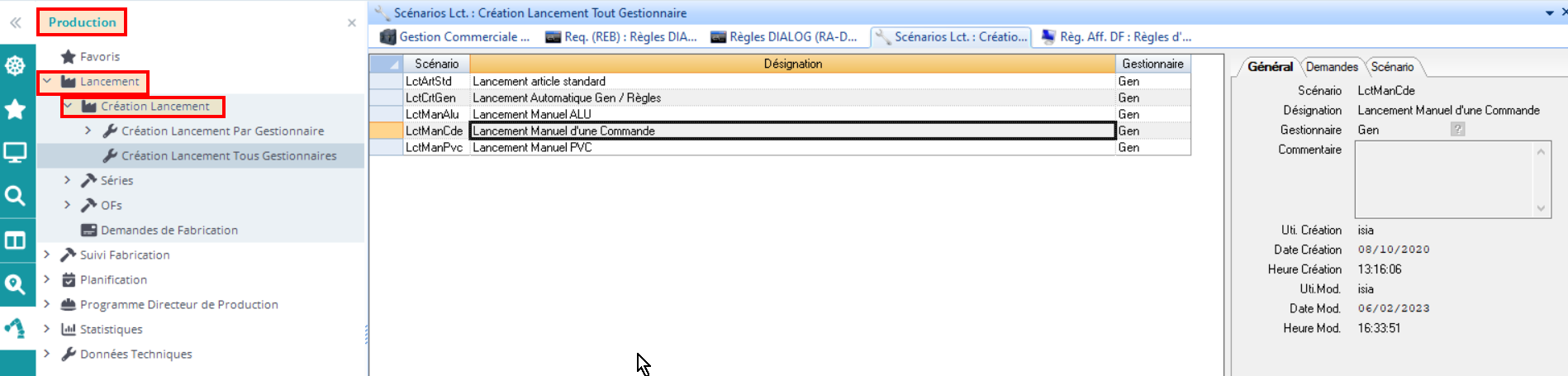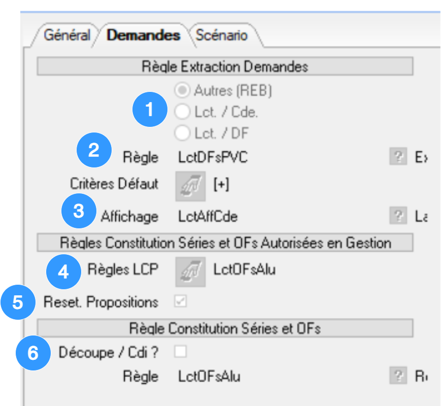 1.Règle extraction Demandes: on choisit ici de quelle manière on veut extraire les demandes de fabrication à afficher dans le tableur de lancement (partie haute de l’outil de lancement). En général on choisit ici “REB”, car ça permet d’avoir plus de liberté pour définir quelles demandes de fabrication extraire ! 2. Règle: On vient renseigner la règle d’extraction de la demande: cette règle permettra de définir quelles Demandes de Fabrication doivent être affichées dans le tableur de lancement, parmi toutes les demandes de fabrication existantes. Comment fonctionne cette requête ? ➡️ Requête REB d' extraction des Demandes de Fabrication ( DF ) pour le lancement 3. Affichage: On renseigne ici la règle d’affichage de la demande: elle permet de définir quelles sont les colonnes du tableur de lancement. Comment gérer cette règle d’affichage ? ➡️ Règle d' affichage du tableur de lancement et requête REB de type RA-DF 4. Règle LCP: on peut renseigner ici plusieurs règles de constitution de séries qui seront disponibles pour l’utilisateur qui utilise le scénario. L’utilisateur choisira dans l’outil de lancement laquelle de ces règles de constitution utiliser (Action Exe. Règle Proposition de Lct.) Règle REB de type LCP de constitution des séries pour le lancement en production 5. Reset. Propositions : Ce drapeau indique si les propositions sont supprimées à chaque exécution de la règle REB/LCP (valeur défaut à Oui). 6. Découpe/Cdi ? Ce champs permet de définir si on doit découper l’OF par rapport au conditionnement de l'article (Fiche Article : Zone Qte Mul Fab , Champ DDArtic.FabQteMul )