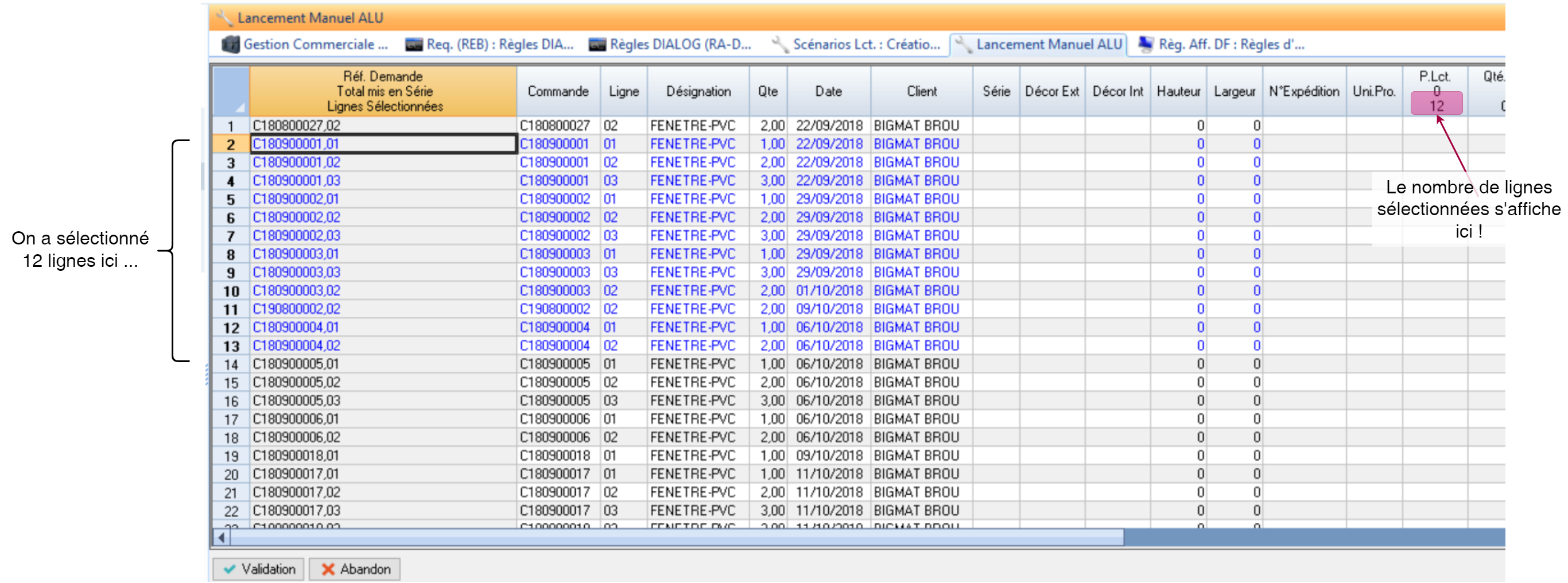 Par exemple: Dans l’atelier ALU, on a l’habitude de fabriquer toutes les menuiseries de couleur blanche le Lundi, les noires le Mardi, etc… Ils faudra donc que notre scénario de lancement regroupe toutes les demandes de fabrication par couleur !