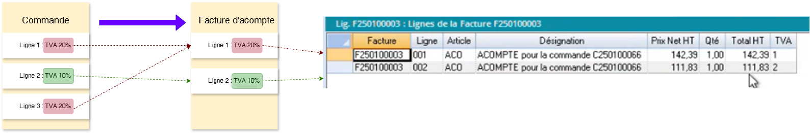 Le montant de chaque ligne de la facture d’acompte est calculé au pro-rata du montant net financier HT des lignes de la commande pour chaque TVA: