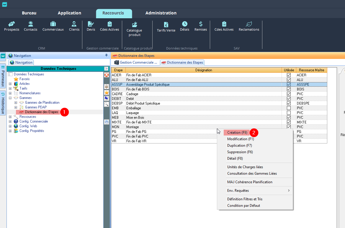 1) On peut créer l'étape dans le dictionnaire des étapes, ou insérer directement une étape qui existe déjà dans le dictionnaire des étapes. De cette manière, cette étape pourra être réutilisée pour être intégrée dans d’autres gammes ! Si on modifie l'étape dans le dictionnaire, elle sera modifiée dans toutes les gammes où elle est utilisée. C’est ce qui est fait le plus couramment !
