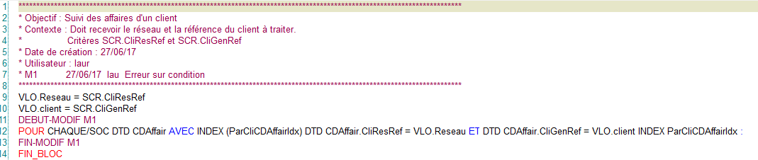 Activation Modif. ?: Traçage ou non des modifications dans la requête DIALOG. Les différentes modifications définies pour la requêtes sont affichées dans le cartouche présenté dans l’écran de saisie de requête et ces modifications peuvent être insérées dans le contenu de la requête en utilisant les mots clés « DEBUT MODIF » et « FIN MODIF » :