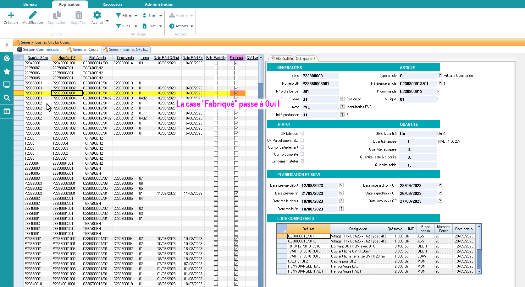 La quantité restante à fabriquer passe à 0 et l’entité devient totalement fabriquée.