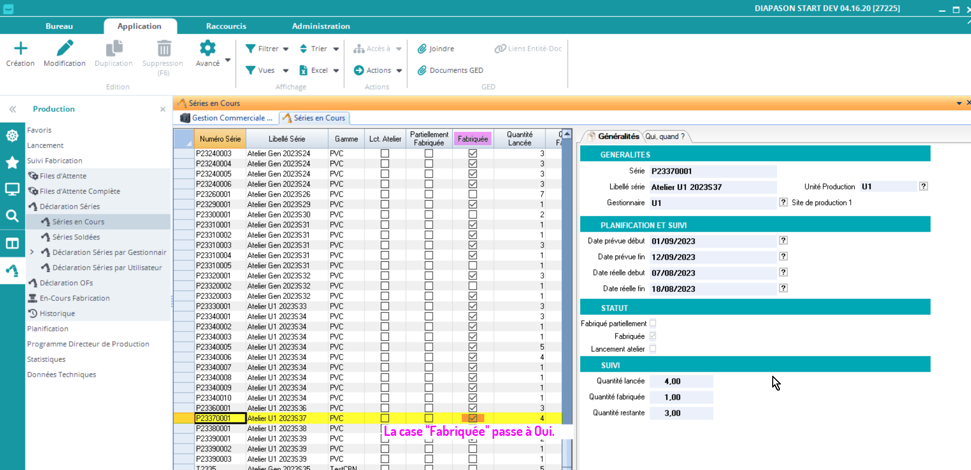 La déclaration de la fin de fabrication de la série entraine la déclaration des dernières étapes de tous les OFs de la série. Les autres étapes de la gamme de suivi file d’attente ne sont pas déclarées automatiquement.