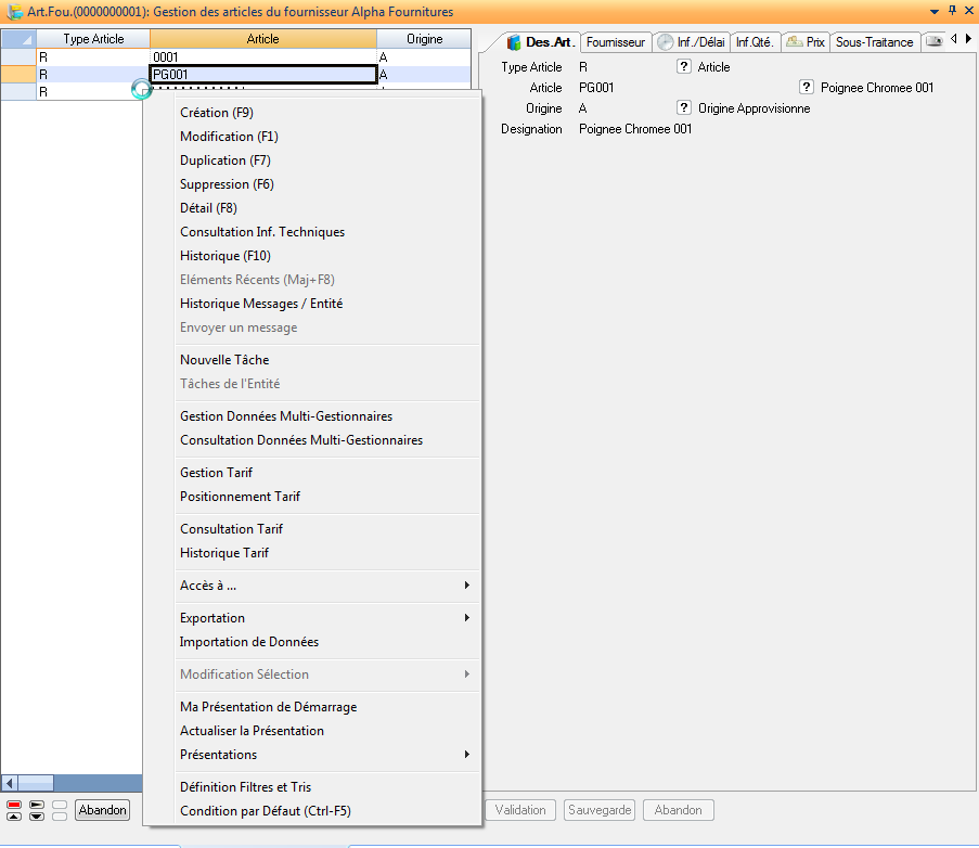 Les Liens Article-Fournisseur sont définis pour les articles standards. Pour les articles sur-mesure, on utilise les liens vari-article fournisseur.