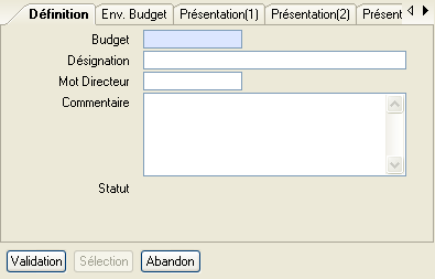 Statut: Statut associé au Budget : vide indique que le Budget n’a pas été validé et ‘VAL’ indique que le Budget est validé.
