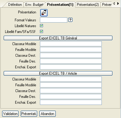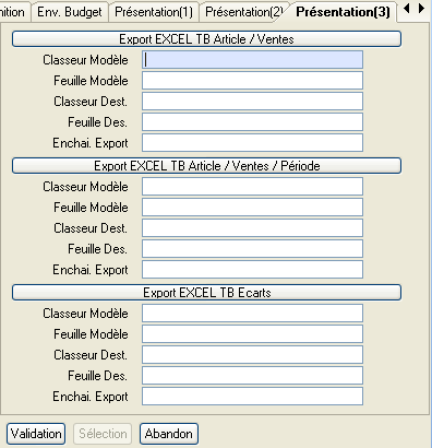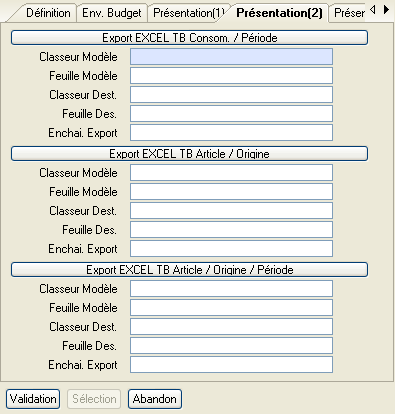 Export Excel TB / Article: Ce tableau de bord de consolidation est lancé par l’action ‘Tableau de bord / Article’ qui se trouve dans le sous menu ‘Consultation’ du menu des Budgets. Lors de l’export vers Excel de ce tableau de bord, il est possible, sur les zones de ce volet, de préciser un classeur et une feuille modèle, un classeur et une feuille destination et d’exécuter une macro.