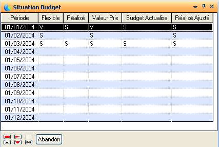 Cette action permet de visualiser l’état d’avancement des différents réalisés d’un budget pour chacune des périodes du budget. Ces réalisés sont définis sur la zone ‘Réalisés Utilisés’ dans l’onglet ‘Env. Budget’ de la définition d’un budget.