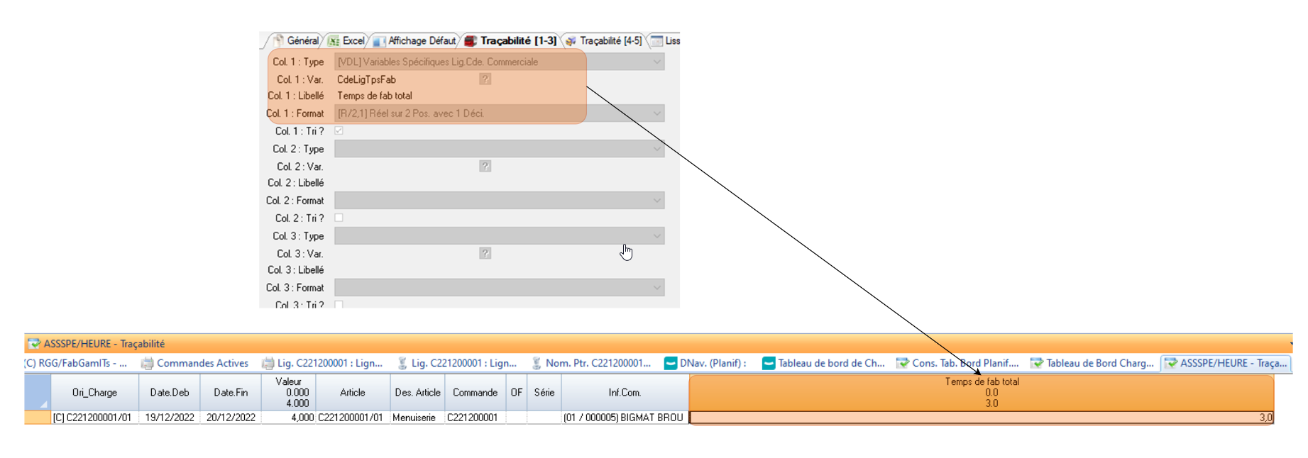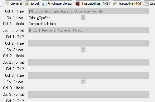 ![]() | Dans le tableau de bord de charge, on peut obtenir plus d’infos sur une charge grâce à l’action Traçabilité ( qui permet de voir à quelles commandes et lignes de commande, OF ou charge externe est liée cette charge..). Ces informations peuvent aider à la décision pour décaler les commandes ou non s’il y a une surcharge ! ( si par exemple il y a des commandes prioritaires, on affiche cette information pour savoir que ces commandes ne sont pas à décaler mais que les autres le sont !). On peut rajouter ces informations sur cet écran de Traçabilité en les sélectionnant sur cet onglet et le suivant ! Il est possible d’alimenter cinq colonnes en précisant pour chacune d’entre-elles : son libellé, son format et la variable qui permet d’alimenter son contenu.
