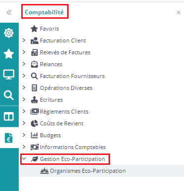La fonctionnalité Gestion Eco-Participation est accessible depuis le module Comptabilité dans l’explorateur :