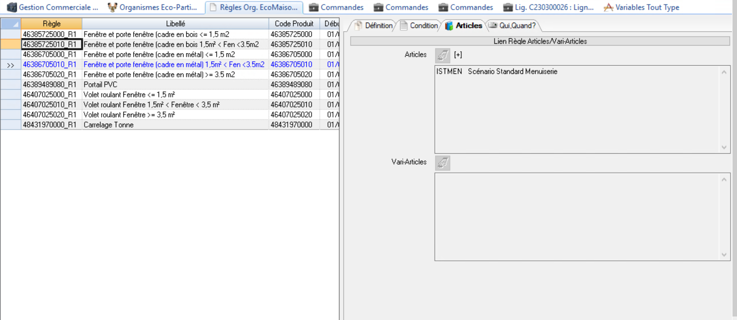 Les règles affectées aux vari-articles seront testées dans le cas de découpe de ligne de commande commerciale.