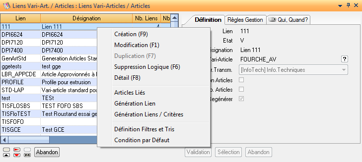 Actions sur les Liens entre Vari-Article et Articles Standards