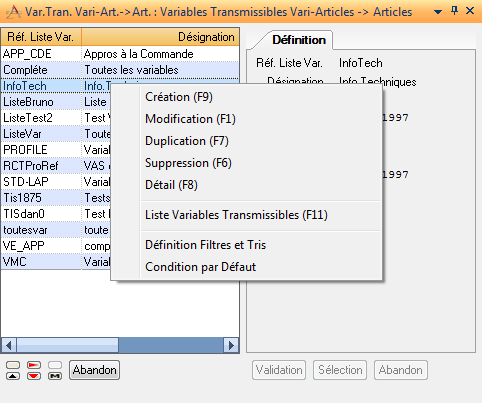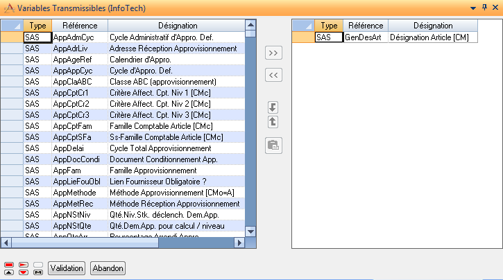 Cette application sert à définir une liste de variables standards et spécifiques à transmettre du vari-article aux articles standards liés.