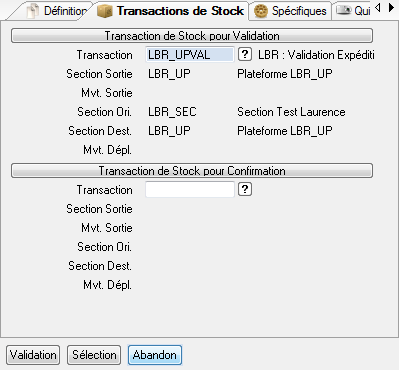 Cet onglet permet de renseigner les transactions de stock de type expédition nécessaire à la réalisation des mouvements de stocks lors des phases de validation et de confirmation de l’évènement d’expédition. Deux transactions de stock sont nécessaires l’une utilisée dans la phase de validation des événements, l’autre dans la phase de confirmation dans le cas ou la réception est gérée. Ces informations sont saisissables uniquement si l’unité de production est gérée comme plateforme logistique (« Uni.Pro. LOG » coché).