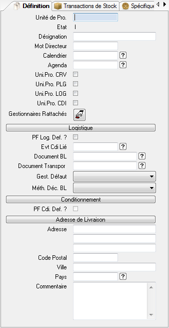 En dehors de la zone « Commentaire », toutes les informations qui suivent sont saisissables uniquement si l’unité de production est gérée comme une plateforme logistique (« Uni.Pro. LOG » est coché).