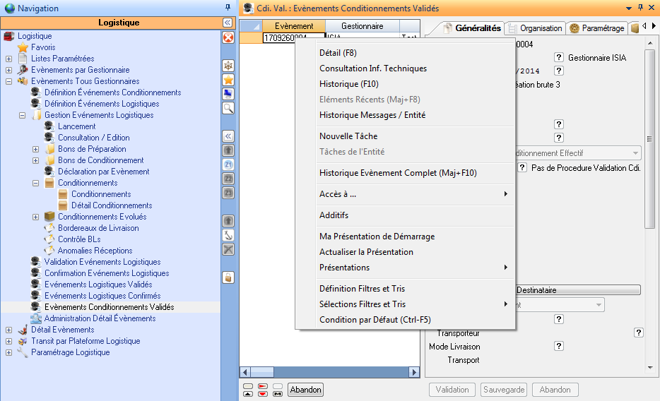 Cette branche applicative permet de consulter les événements de conditionnement validés.
