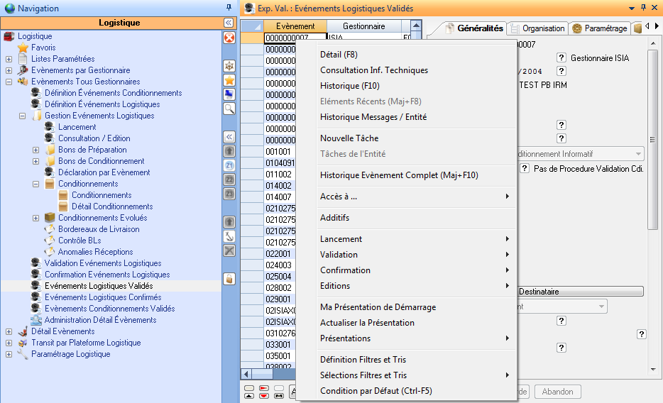 Cette branche applicative permet de consulter les événements logistiques validés afin d’annuler la validation si nécessaire.