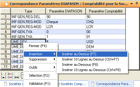 Ce tableur permet d’établir les correspondances entre les paramètres DIAPASON et les paramètres d’une comptabilité extérieure afin de pouvoir effectuer une conversion lors de l’export de données comptables. Il est accessible depuis les sociétés comptables :