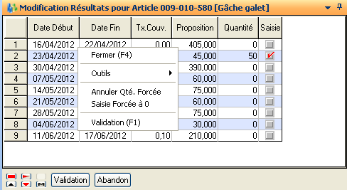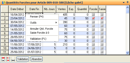 La saisie des quantités forcées pour l’article courant est lancée par l’action « Saisie Quantités Forcées ». Cette action lance un tableur présentant les quantités forcées pour toutes les périodes de la classe de périodicité de l’article.