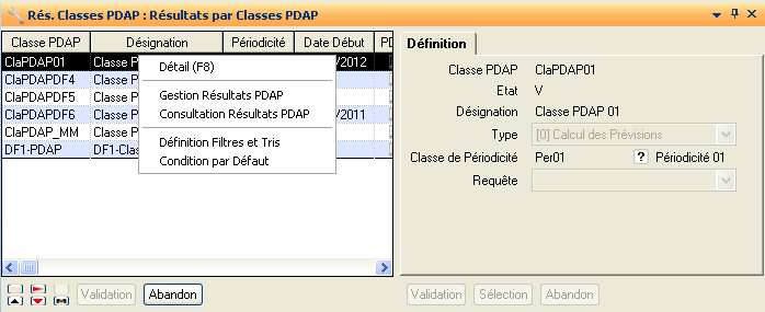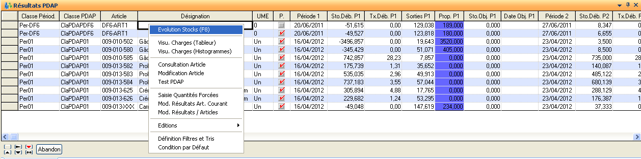 Les résultats sont présentés pour les trois prochaines périodes non figées, les articles étant triés par classe de périodicité et classe PDAP :