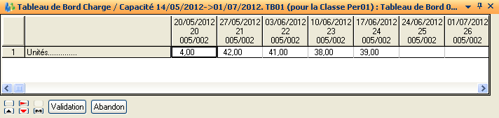 La Modification des quantités à fabriquer pour l’article courant est lancée par l’action « Modif. Résultats Art. Courant ». Cette action lance un tableur présentant les quantités à fabriquer pour les périodes prises en compte dans le calcul du PDAP de l’article.