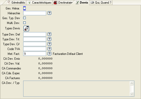 Zone facultative. Indique si on gère le type de devis pour cette affaire. Saisi en modification uniquement si aucune structure hiérarchique ou aucun devis émis n’existe pour l’affaire. Voir Type de Devis.
