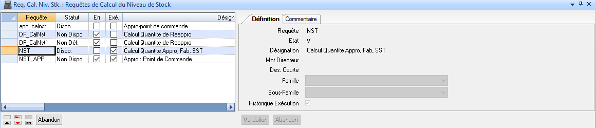 Sur l’application de définition des requêtes de calcul, il est possible d’indiquer, pour une requête de calcul donnée, si on trace ou non son exécution. Pour cela, la colonne « Exe » a été ajoutée dans la liste et la zone « Historique Exécution » dans la fiche.