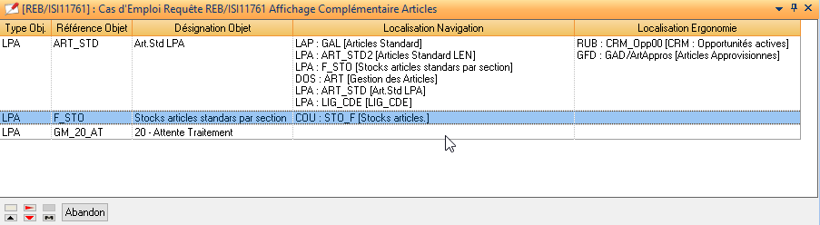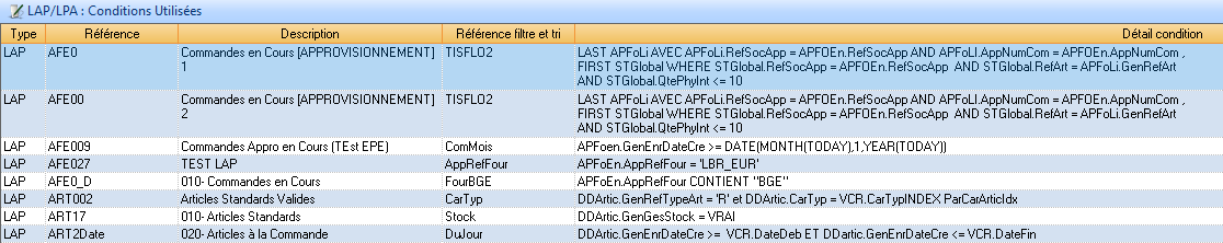 L’application présente les deux types de listes (LAP/LPA) sous la forme suivante. Ses objectifs sont de contrôler la qualité du paramétrage et optimiser les accès.
