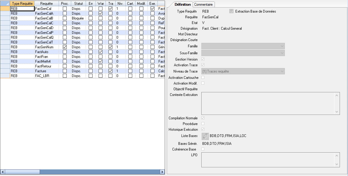 Sur l’application de définition des requêtes, il est possible d’indiquer, pour une requête donnée, si on trace ou non son exécution. Pour cela, la colonne « Exe » a été ajoutée dans la liste et la zone « Historique Exécution » dans la fiche.