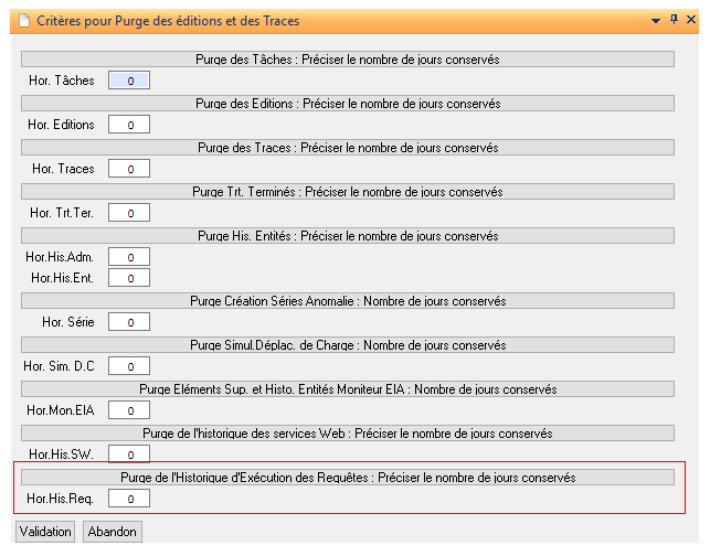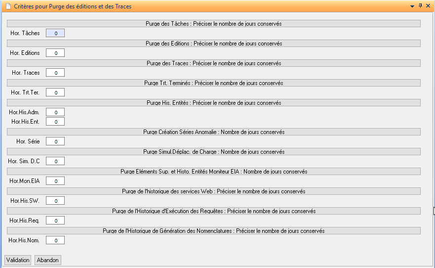 La purge des historiques de génération des nomenclatures est faite dans le traitement Diapason « PUR-TRA : Purge des Editions et des Traces » en renseignant le nombre de jours d’historique à conserver.