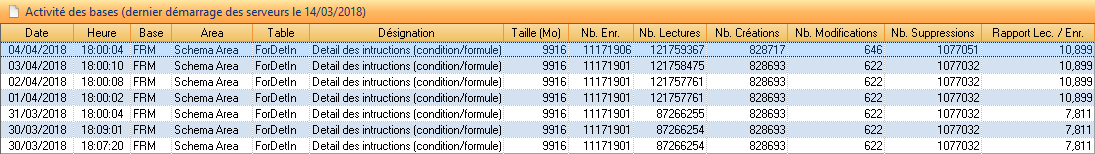 Les données statistiques sur l’activité des tables sont remises à zéro à chaque redémarrage des serveurs des bases. Le titre informe de cette date.
