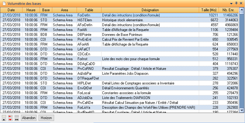 Les filtres et tris sont disponibles sur toutes les colonnes. Les résultats sont stockés à date et heure du déroulement du traitement STATS-DB. Il est donc possible de suivre l’évolution d’une table sur une période donnée (changement d’horizon) en filtrant sur la table désirée.