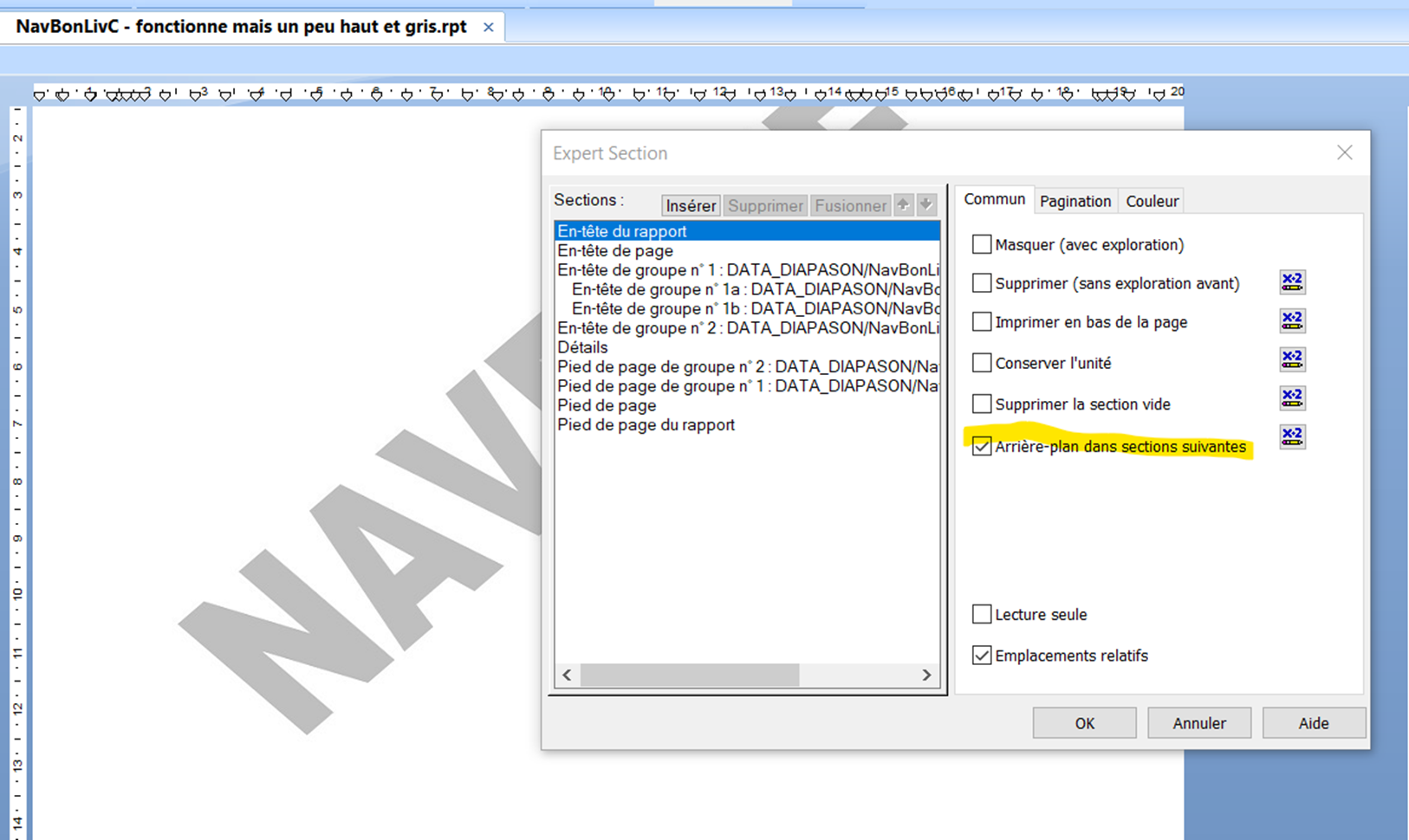 Si vous souhaitez mettre un texte en filigrane dans un document, il conviendra de placer dans l’en-tête du rapport un OBJET OLE en cochant ‘Arrière-Plan des sections suivantes’.