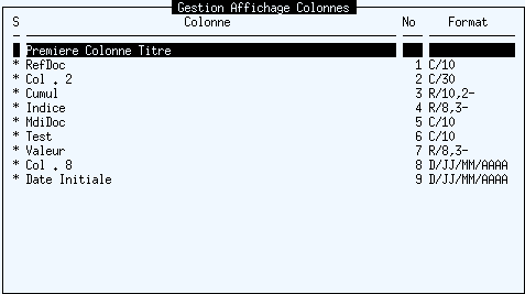 Colonnes | Permet d'enlever des colonnes et de modifier le format d'affichage de chaque colonne. | C / G |