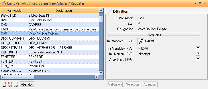 Cette application permet de définir les règles pour initialiser des variantes, variables, nomenclatures et choisir des gammes génériques. L’explication de l’association de ces requêtes au vari-article est traitée dans la documentation 0300_CO_Admin_des_Ventes_01.doc.