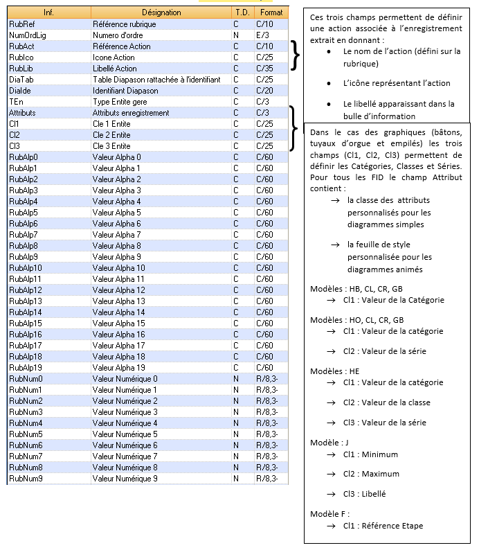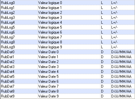 Les champs RubAlp*, RubNum*, RubLog*, RubDat* sont libres et permettent d’alimenter l’affichage de la rubrique et les critères nécessaires aux actions paramétrées sur la rubrique.
