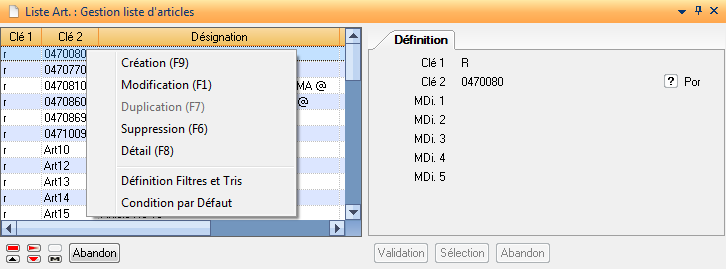 A partir des informations MDi 1 à MDi 5, cinq possibilités de tri sont disponibles en affectant les variables MotDir_Niv1 à MotDir_Niv5 dans la condition d'entité sur Article.