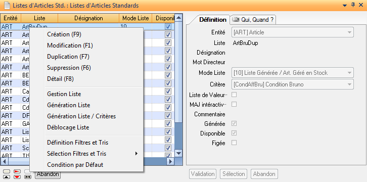 Cette action est activée uniquement pour les listes d'articles générées par article géré en stock (Mode Liste = '10').